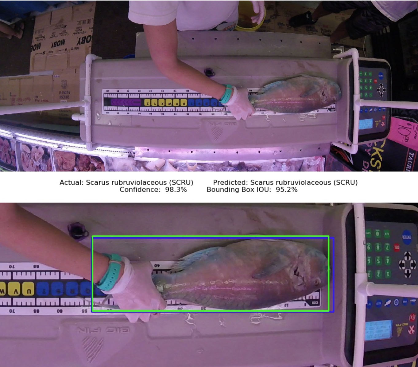 Figure: Image of a labeled fish with species and bounding box predictions.